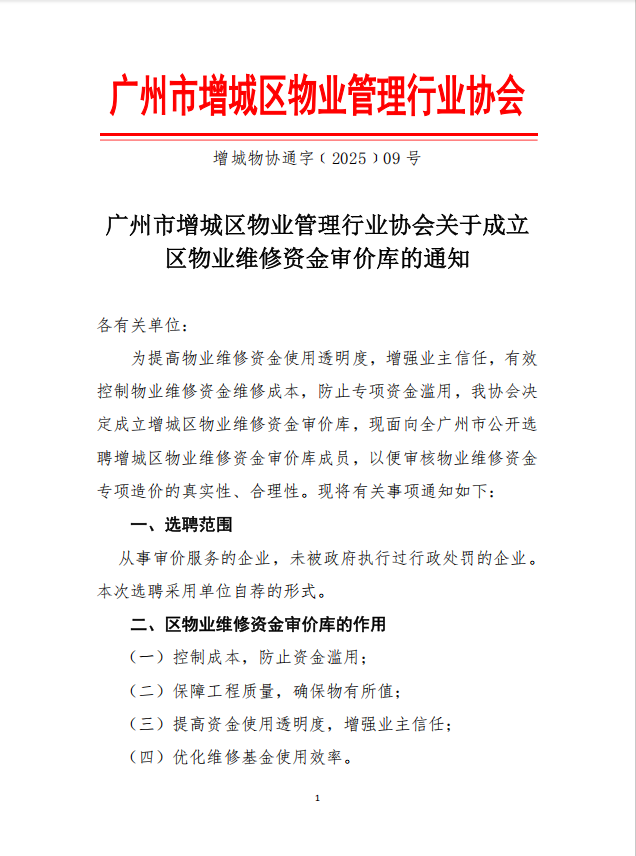 广州市增城区物业管理行业协会关于成立区物业维修资金审价库的通知