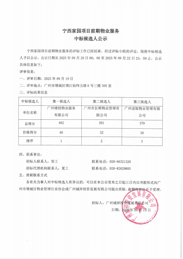 宁西家园项目前期物业服务中标候选人公示