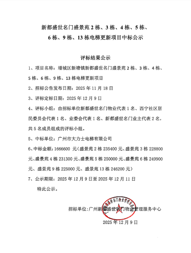 新都盛世名门盛景苑2栋、3栋、4栋、5栋、6栋、9栋、13栋电梯更新项目中标公示
