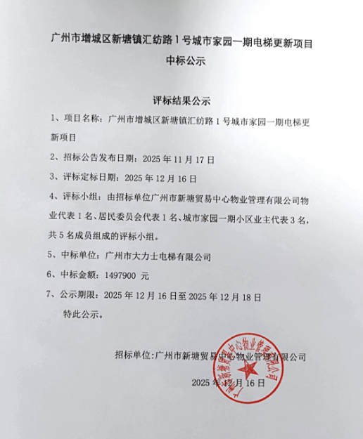 广州市增城区新塘镇汇纺路1号城市家园一期电梯更新项目中标公示