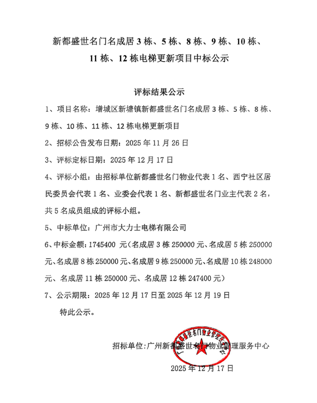 新都盛世名门名成居3栋、5栋、8栋、9栋、10栋、11栋、12栋电梯更新项目中标公示