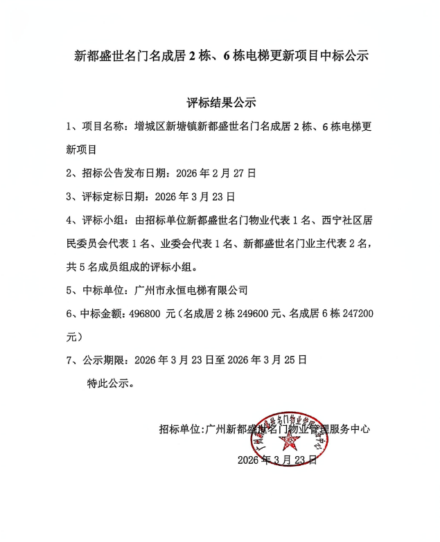 新都盛世名门名成居2栋、6栋电梯更新项目中标公示