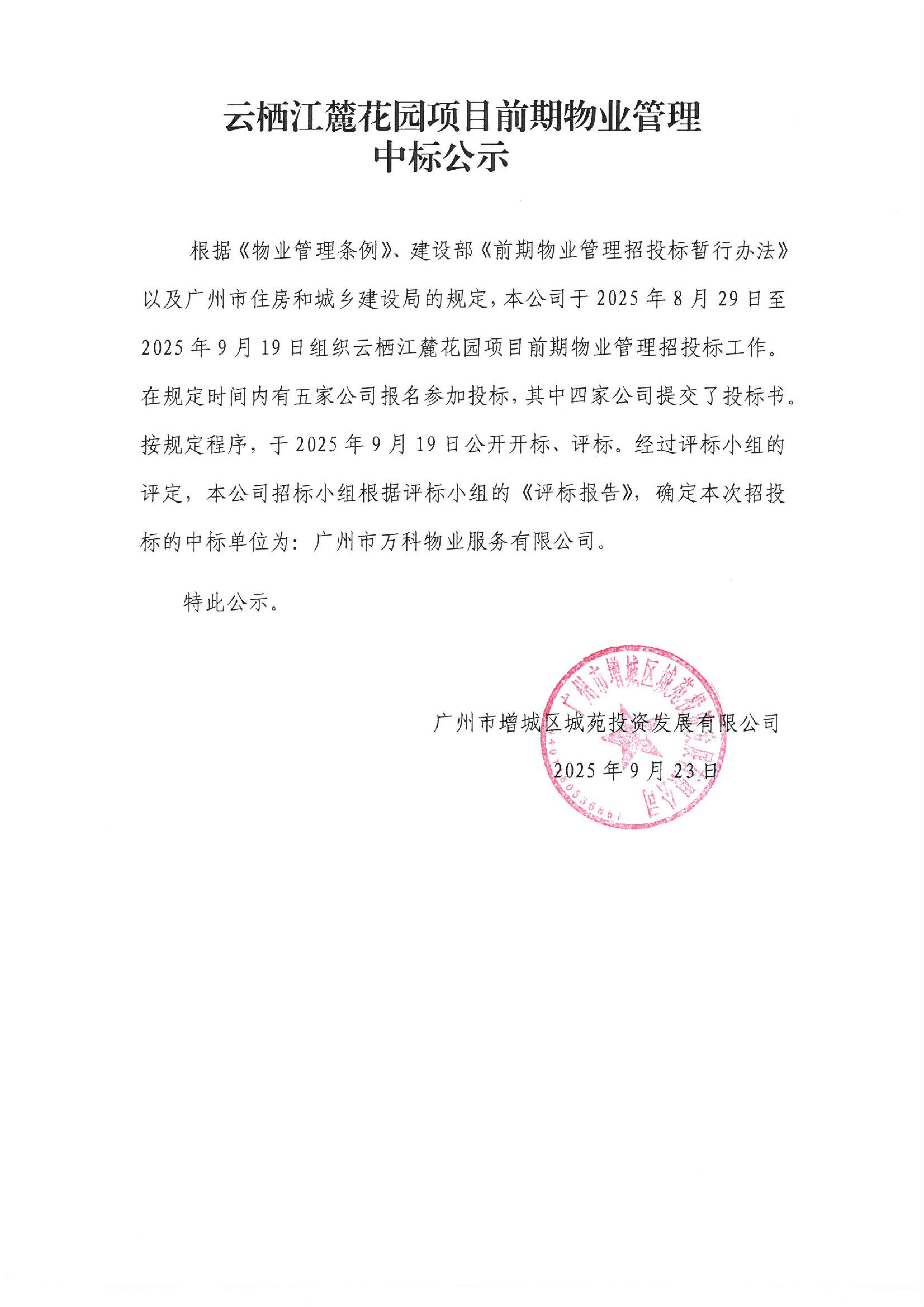 根据《物业管理条例》、建设部《前期物业管理招投标暂行办法》以及广州市住房和城乡建设局的规定,本公司于2025年8月29日至2025年9月19日组织云栖江麓花园项目前期物业管理招投标工作。